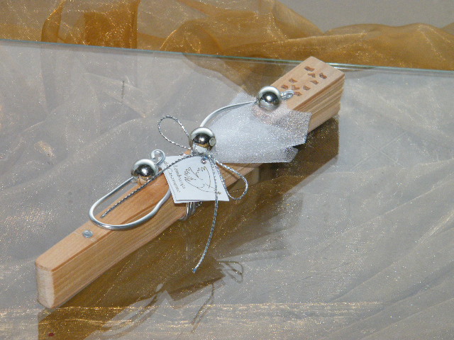 Leque em madeira decorado com organza branca, arame e perolas prata
