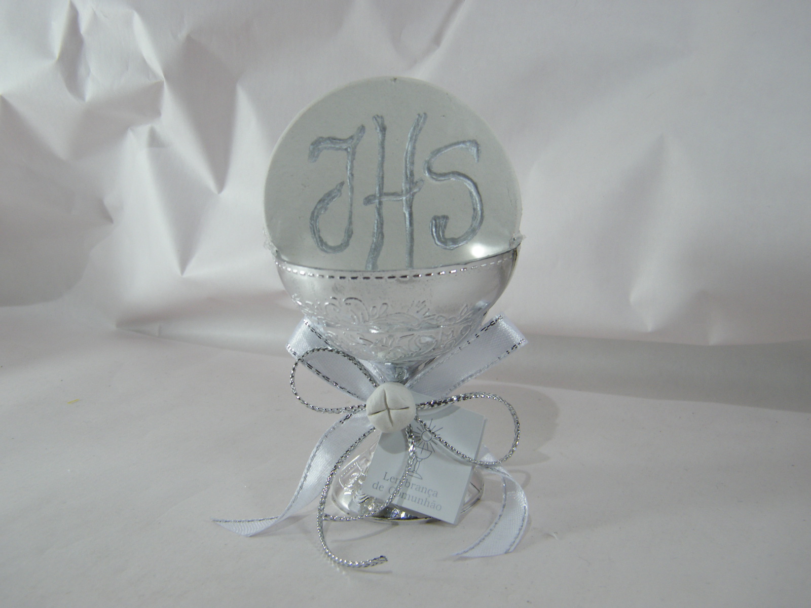 Cálice prateado (7cm) com uma hóstia gigante, decorado na base com um lindo laço em fitas de setim e um pão no remate do laço.