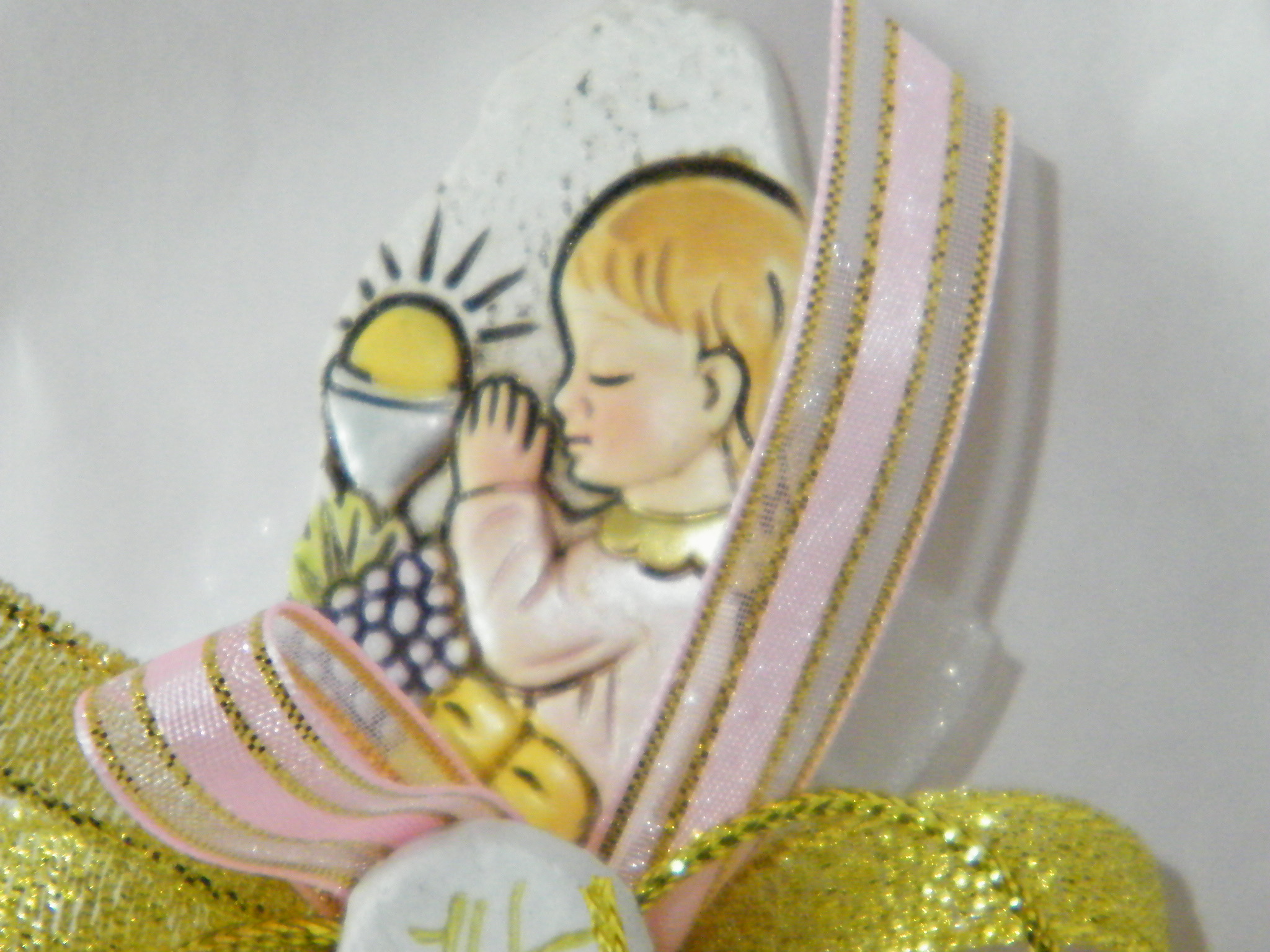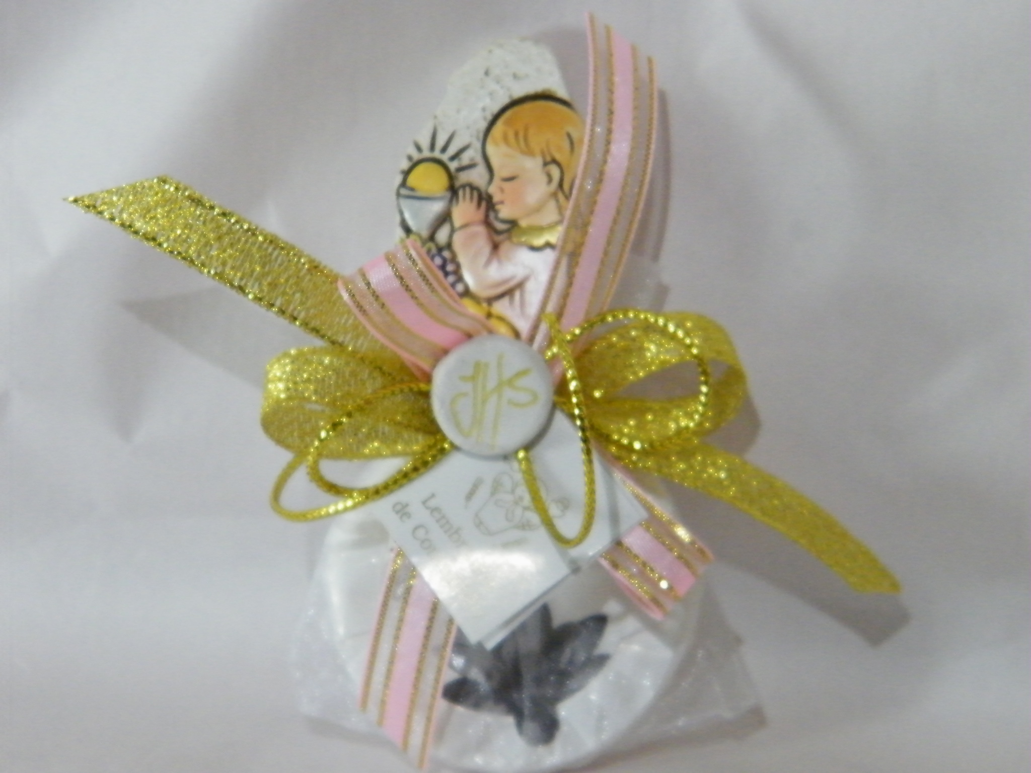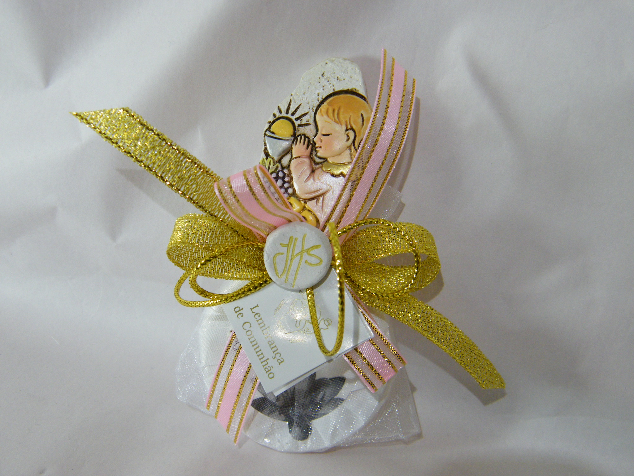 Saco em organza com sabonete no interior decorado com uma placa menina comunhão em resina, laços cruzados em fitas organza rosa e fita areada dourada, renata este lindo laço com uma hóstia.