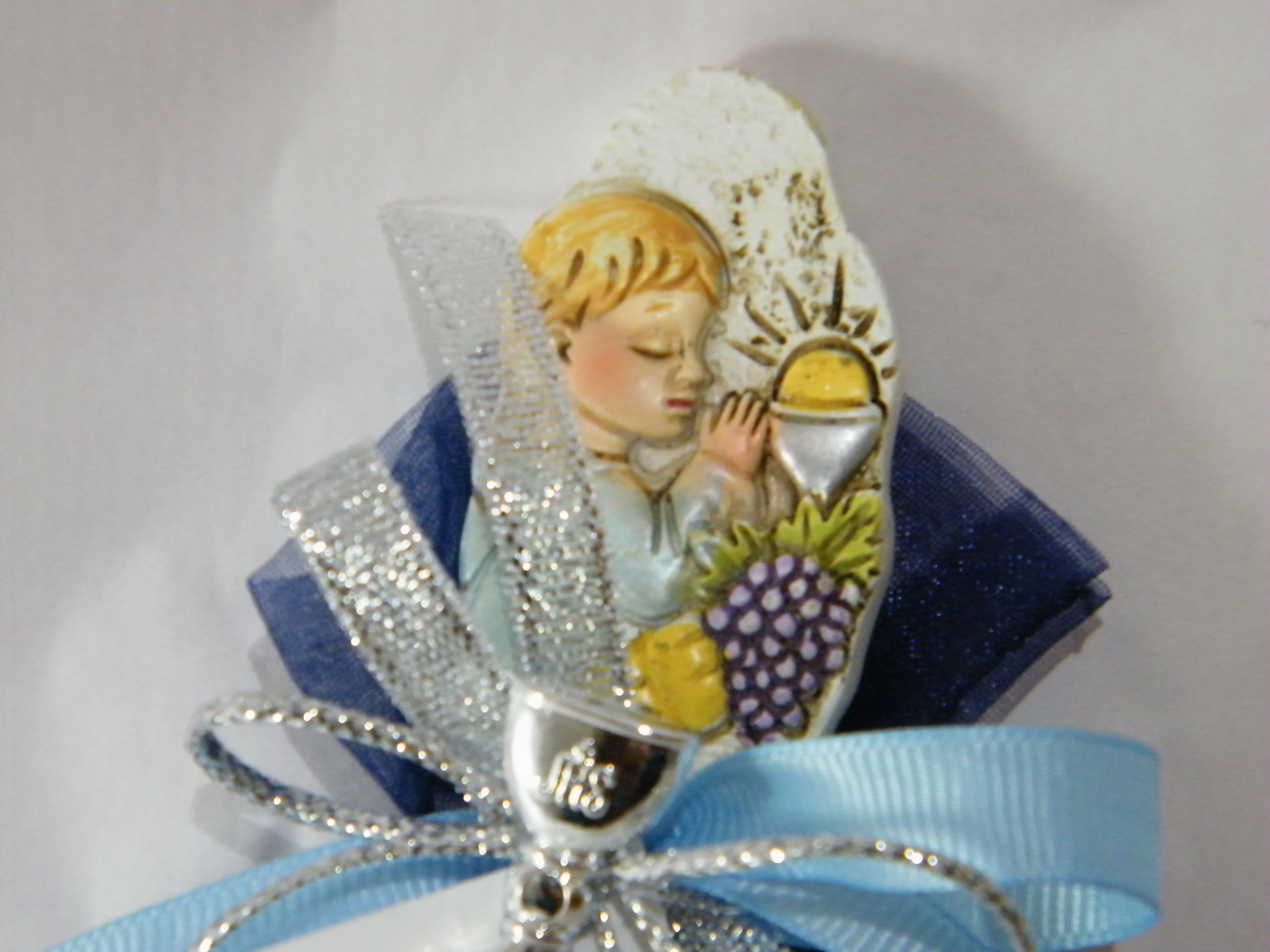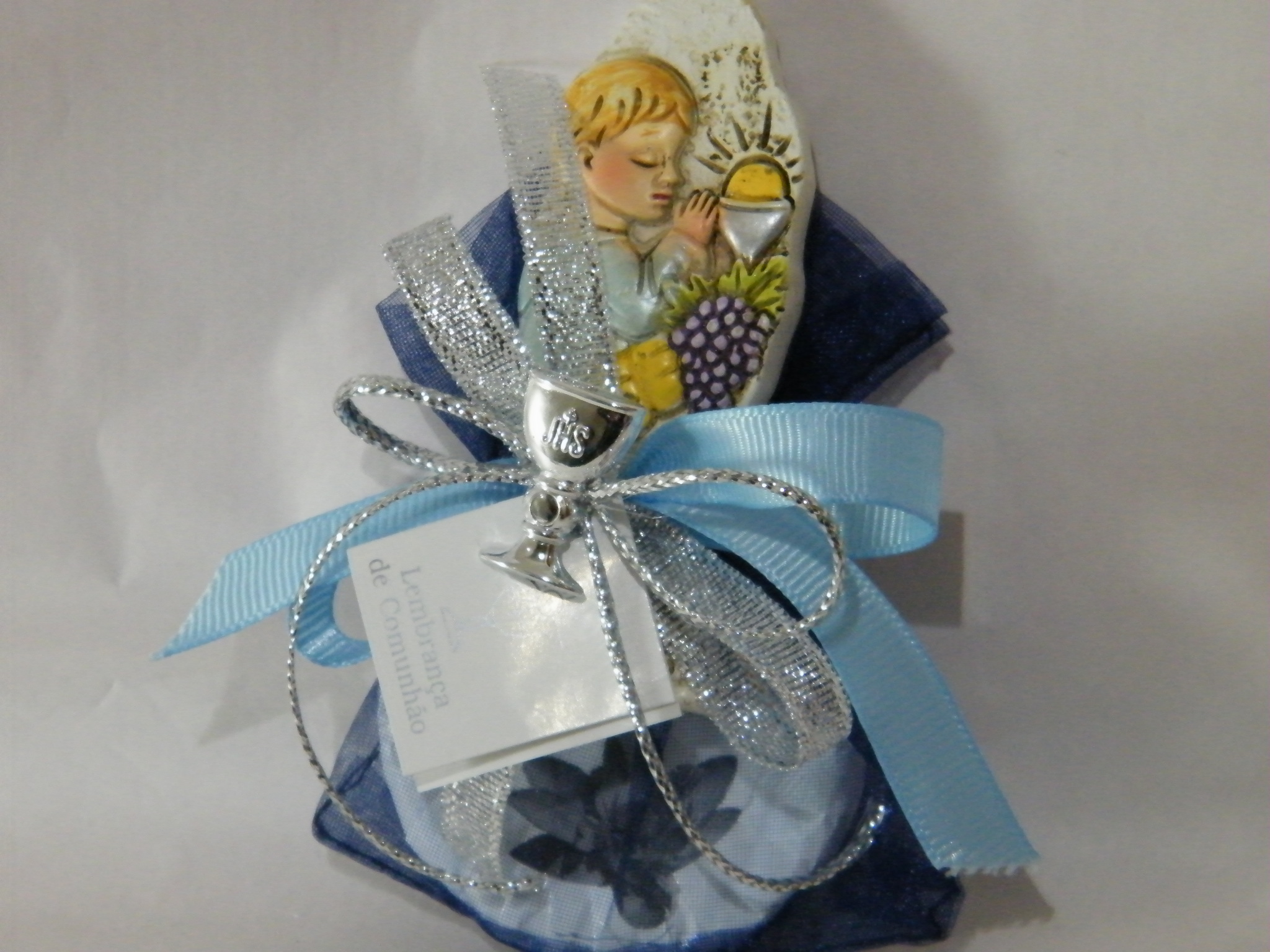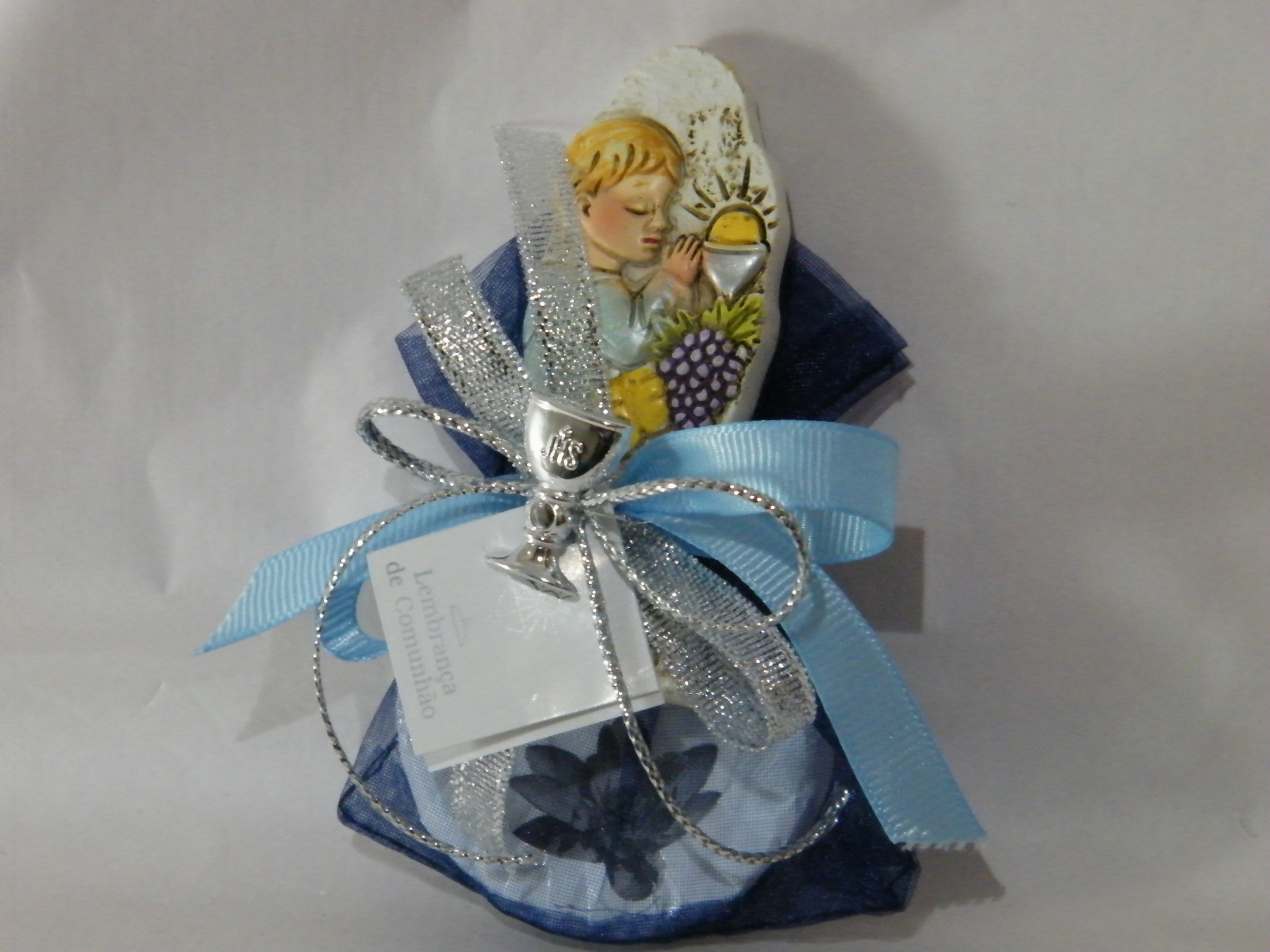Saco em organza azul com sabonete no interior decorado com uma placa menino comunhão em resina, laços cruzados em fitas gorgorão azul e fita areada prata, renata este lindo laço com um Cálice .