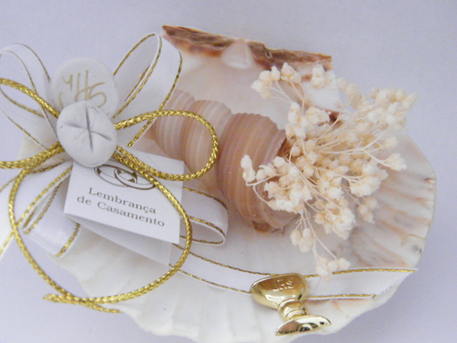 Concha com buzio cornucópia natural adornado com brume, decorado com laço em fita setim perola, fio dourado, pão e hóstia no remate do laço, terminar um bonito ostensório dourado.