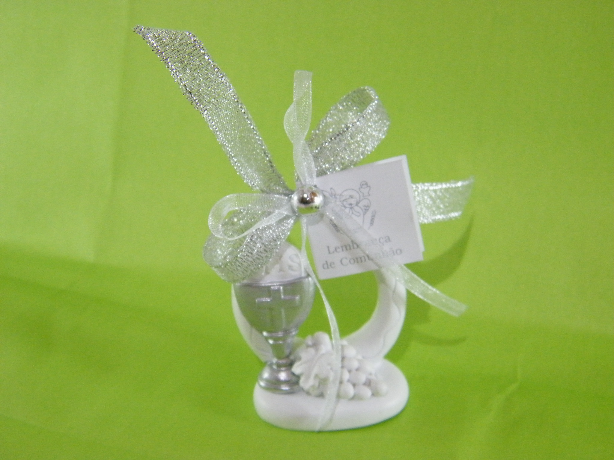 Bonita base em cerâmica branca com cálice da hóstia sagrada e cacho de uvas, adornada com laço em fita areada prata e meia esfera prata.