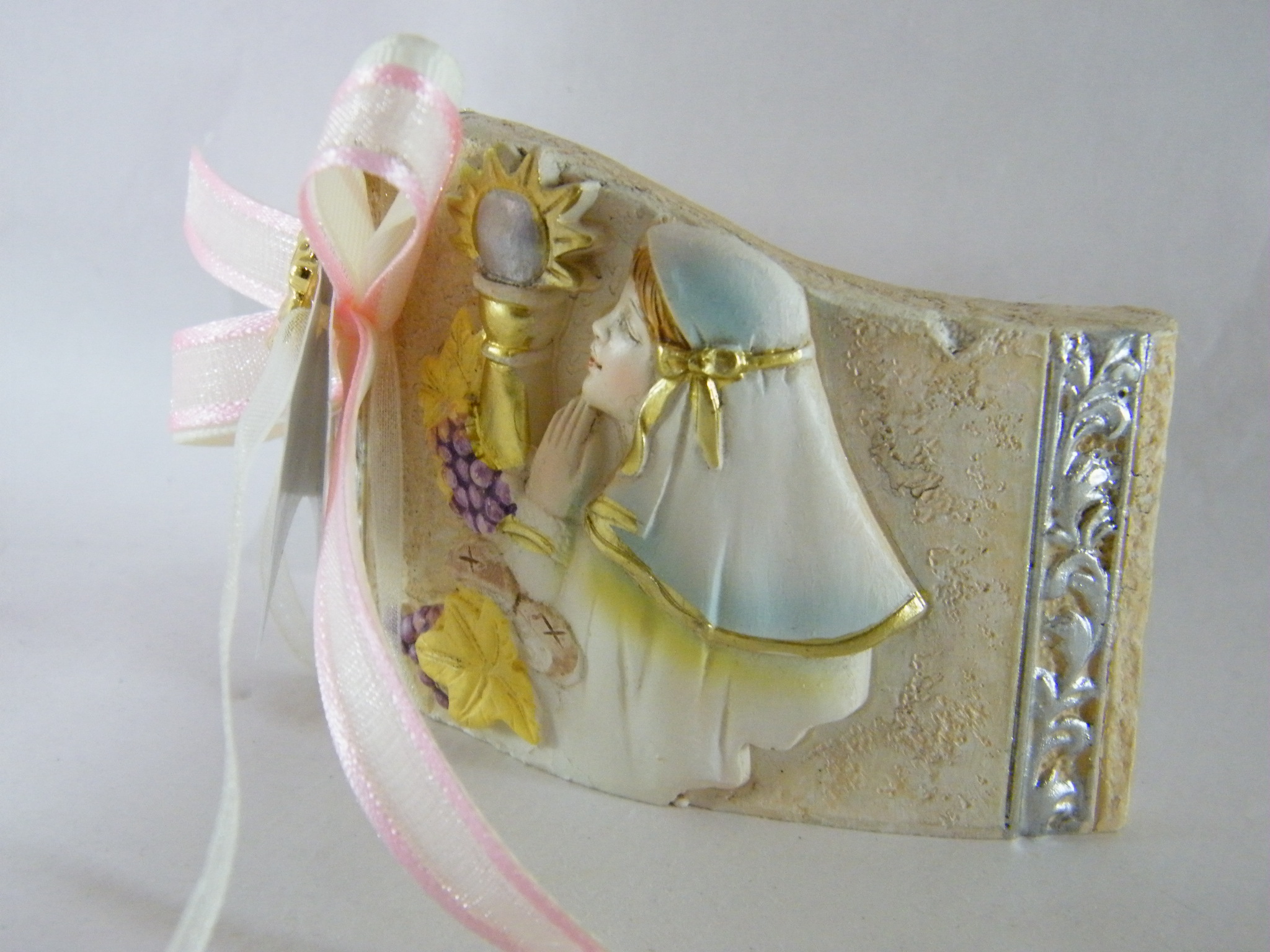 Pisa papeis curvo em cerâmica menina decorada com um bonito laço em fitas gorgorão e organza.