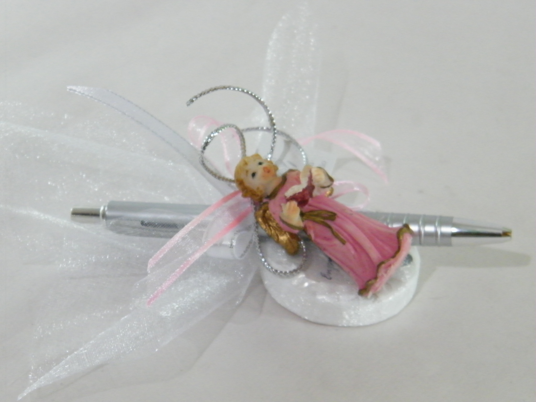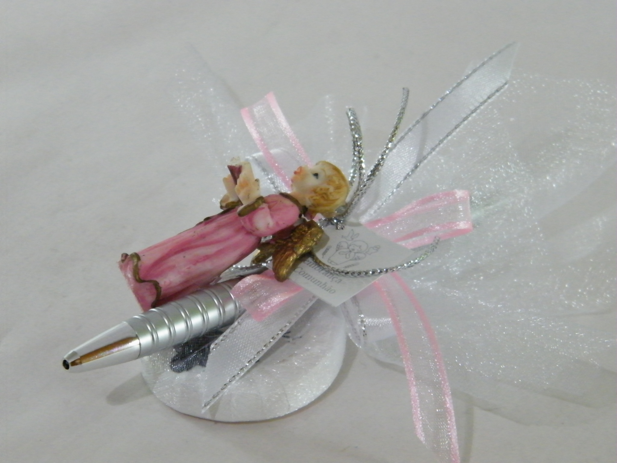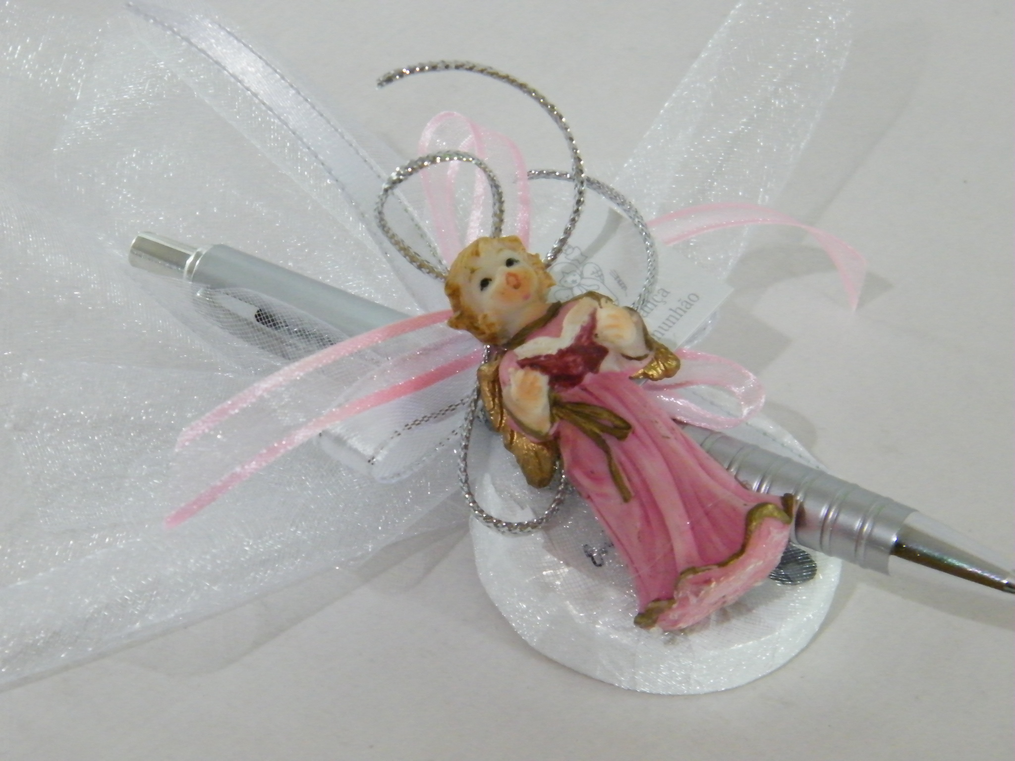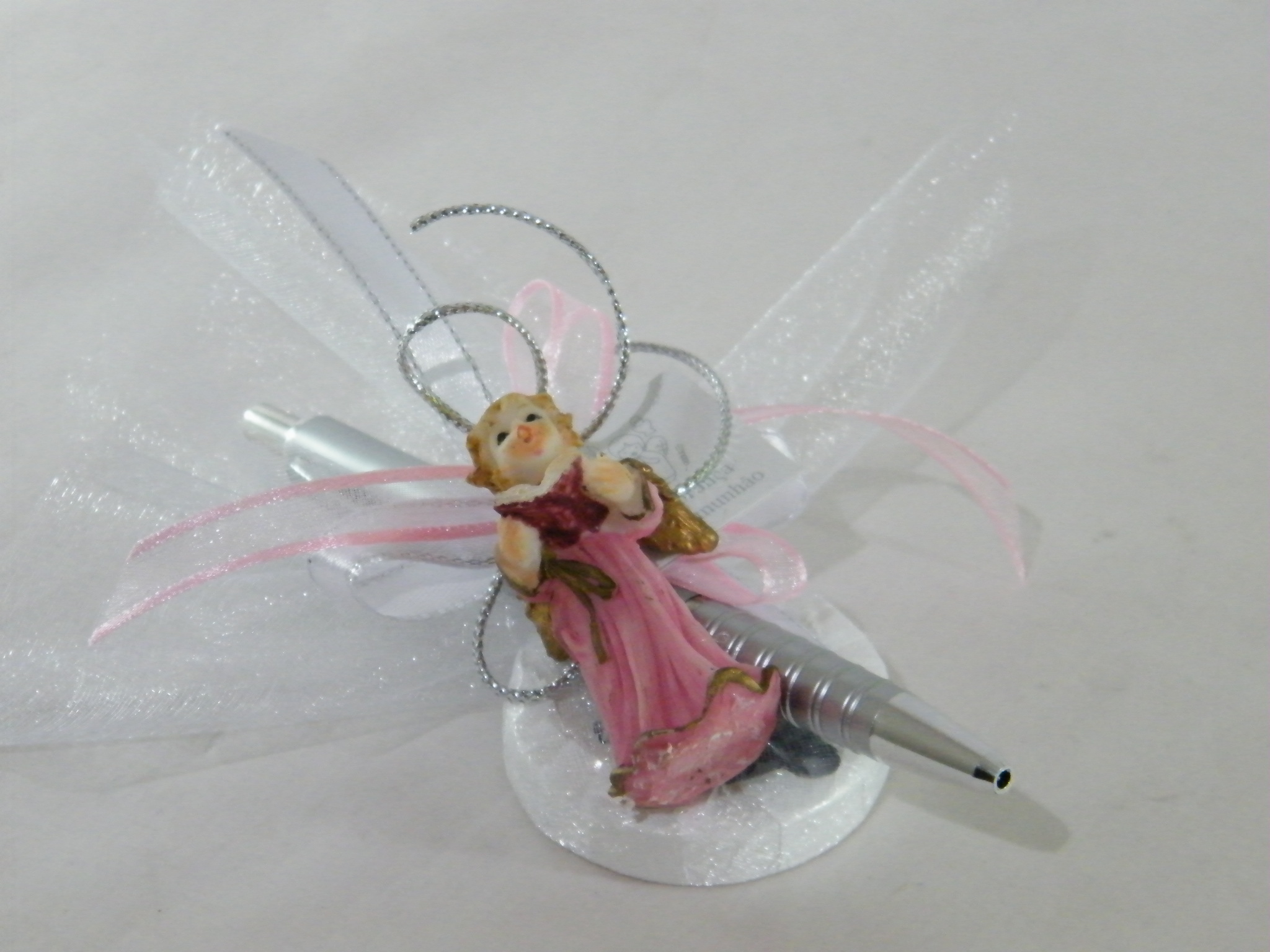 EntrarCaneta prata escrita azul adornada com um sabonete no tule branco, laços cruzados em fitas setim branco de rebordo prata e fita azul em organza, rematamos com um amoroso anjo azul com instrumentos musicais .