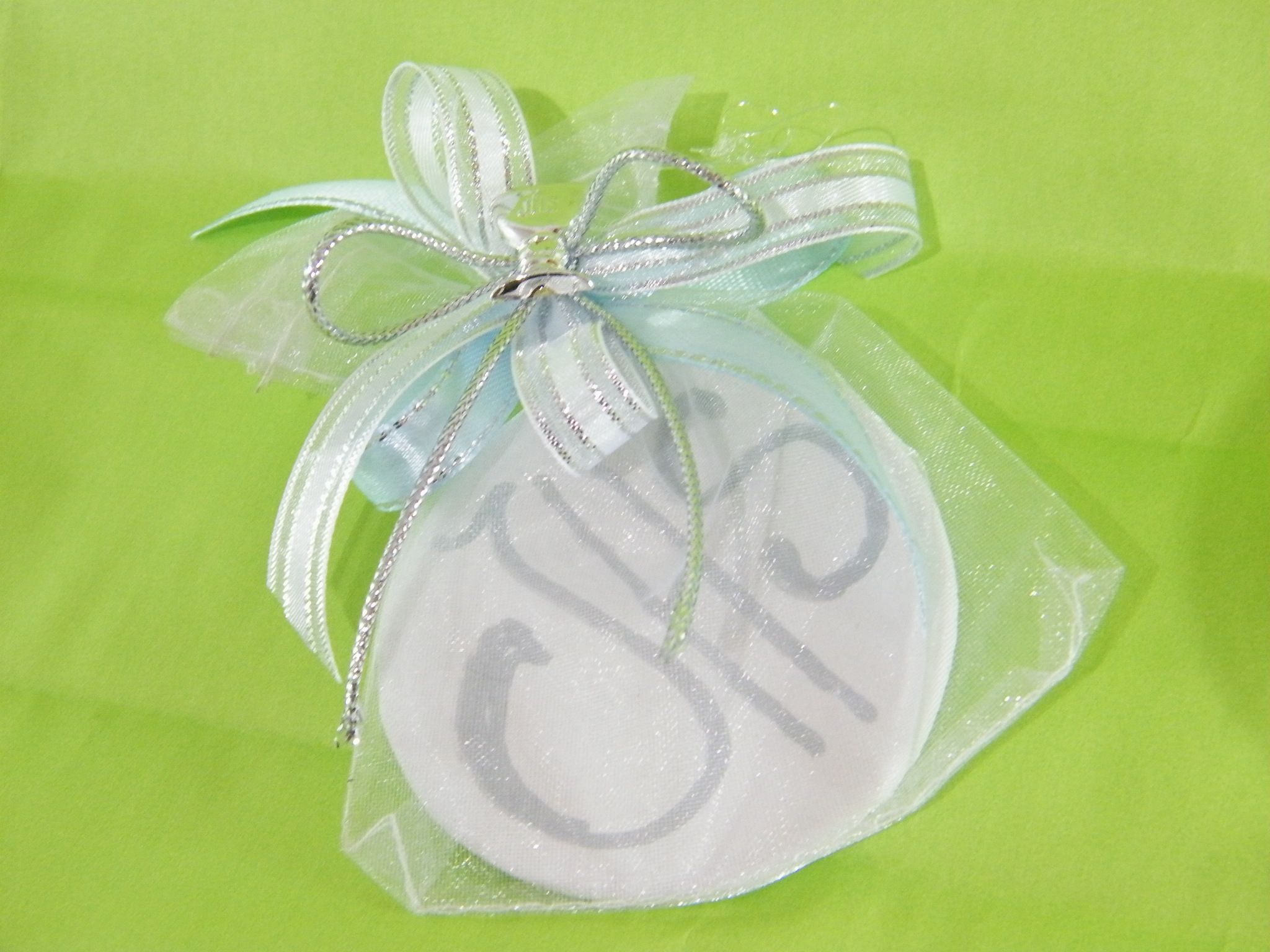 Saco em organza, com uma Hóstia no interior, decorado com lindo laço cruzado em fitas setim azul com rebordo prata e fita organza branca, remata com um bonito cálice prateado.