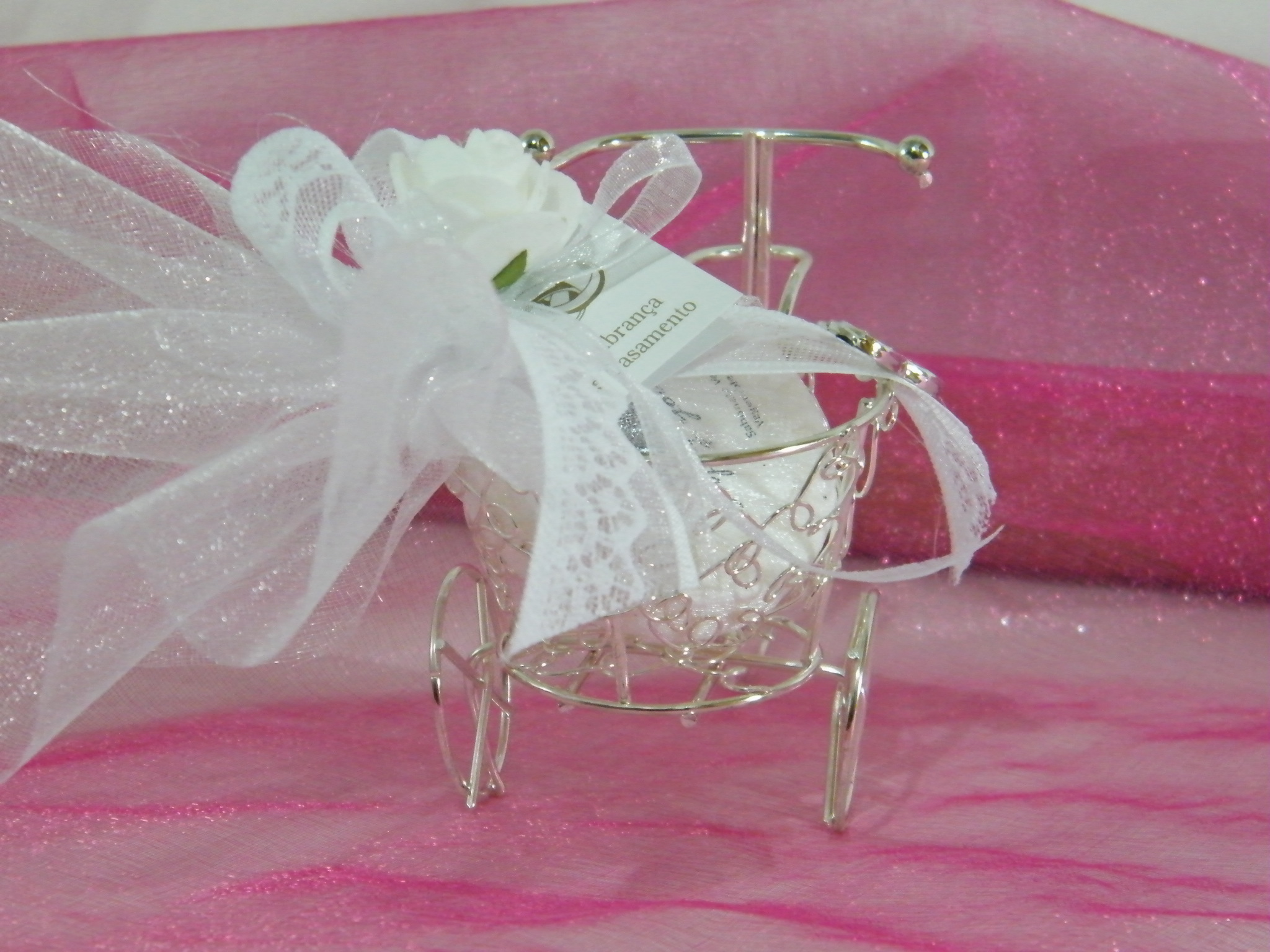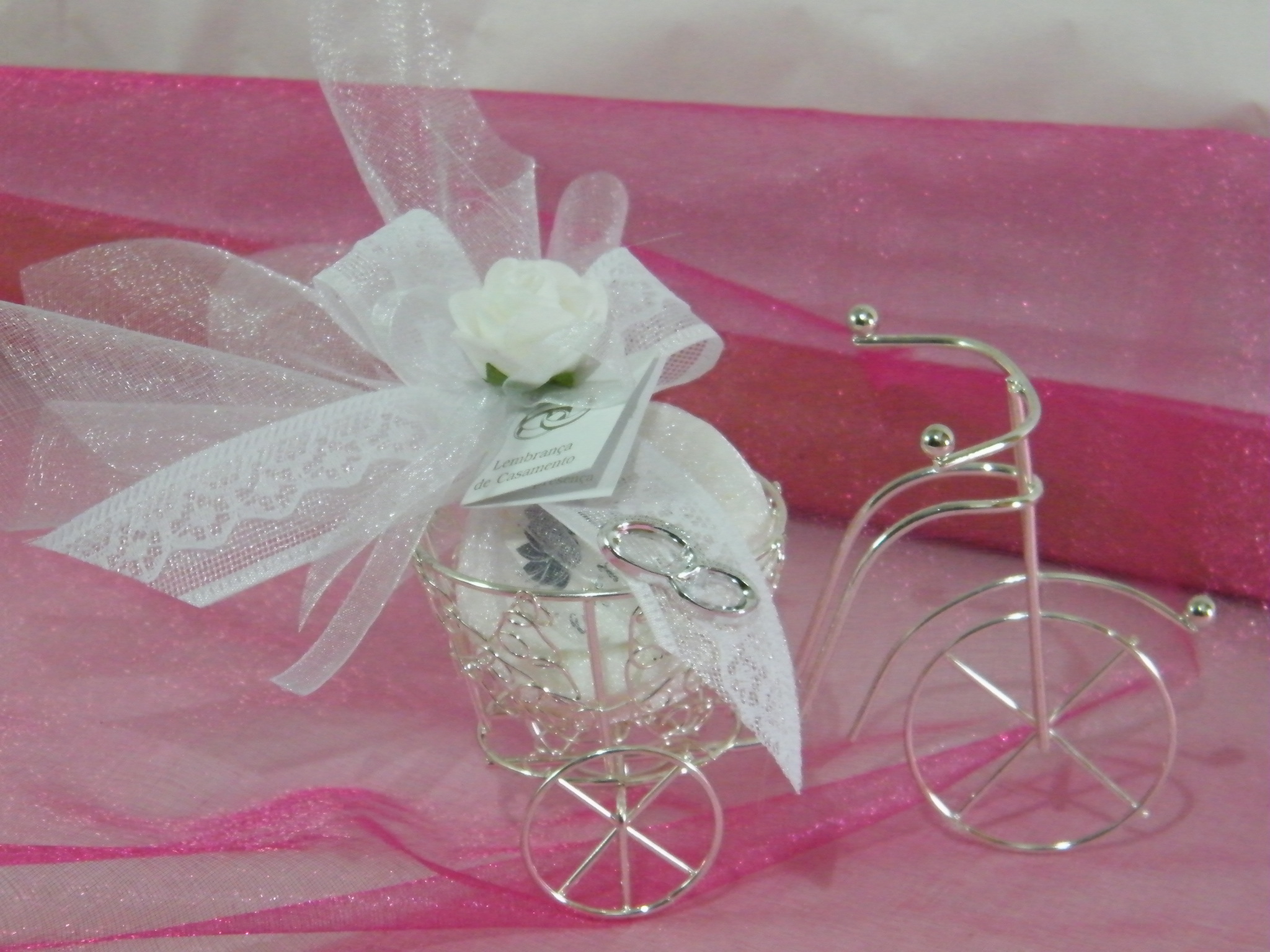 Triciclo arame decorado com sabonete tule branco decorado com fita rendada branca, flor e aliança.