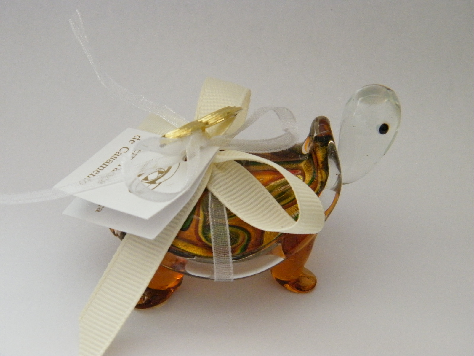 Amorosa tartaruga em vidro 7cm x 4cm decorada com laço em fita gorgorão e alianças.