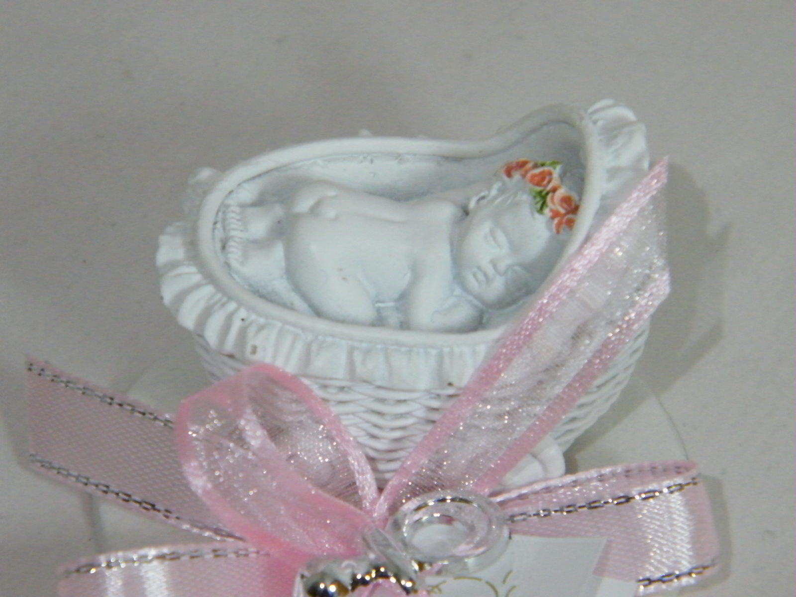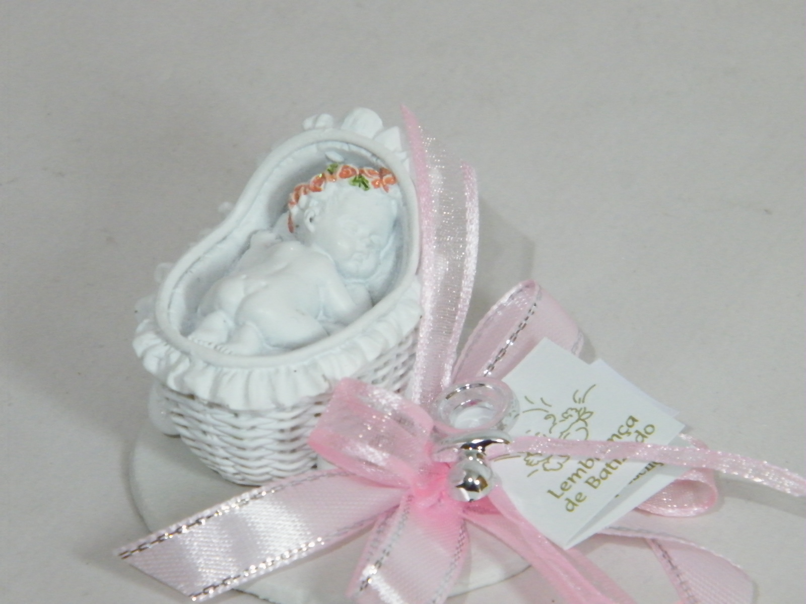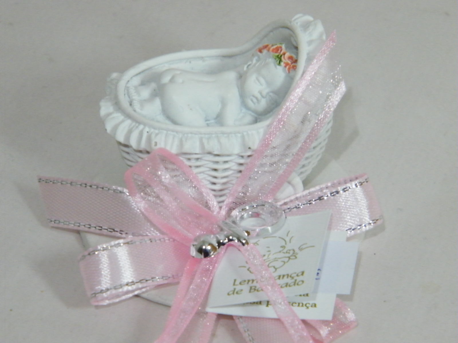 EntrarCarrinho bebe (5cm x 3cm x 4cm) com amoroso bebe a dormir em cerâmica branca, sobre base decorada com um bonito laço duplo cruzado em fitas setim e organza nos tons cor de rosa e uma chupeta prata no remate.