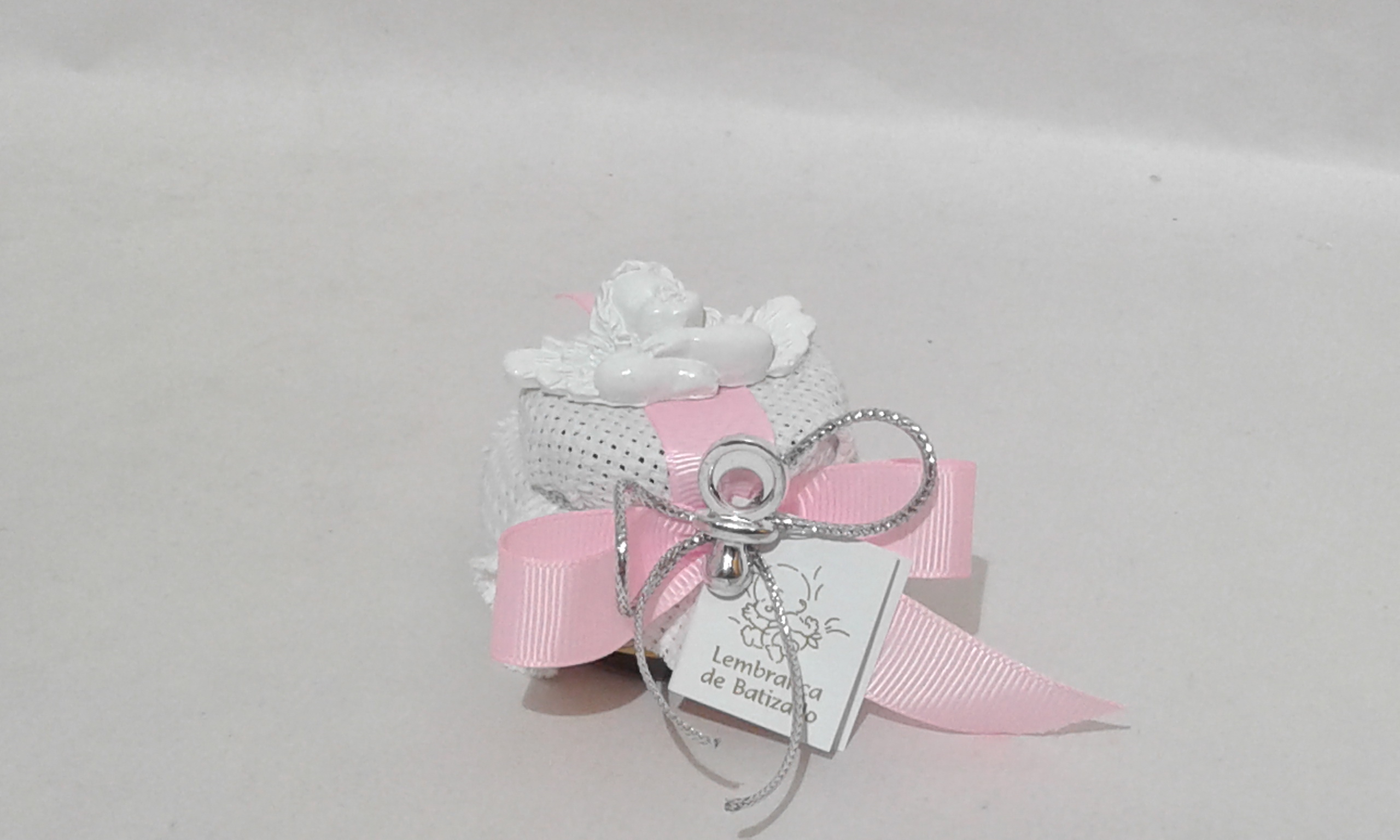 Frasquinho mel 32gr decorado com sarapelheira branca, laço cruzado em fita gorgorão cor de rosa, chupeta prata no centro do laço e um amoroso anjinho na tampa.