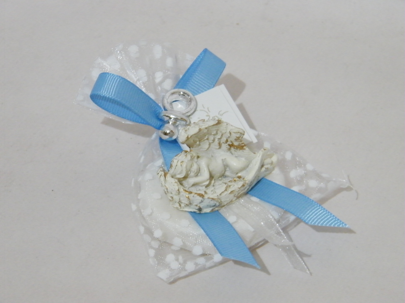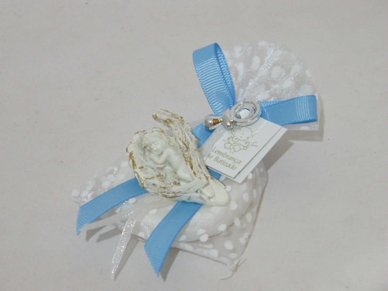 Bonito saquinho em organza as bolinhas com sabonete no interior. Decorado com laço em fita gorgorão azul, chupeta prata e um amoroso anjinho a dormir nas suas asas.