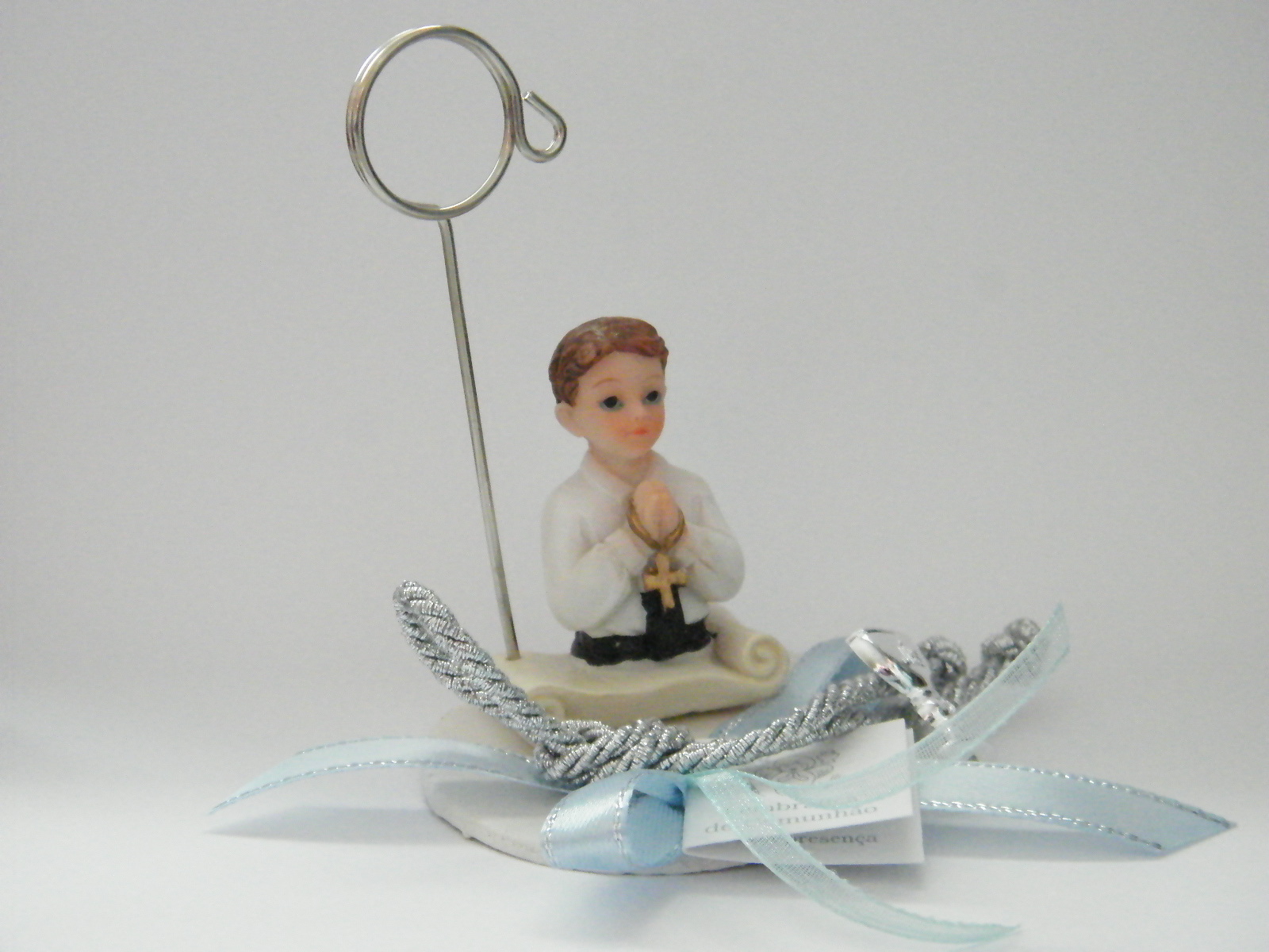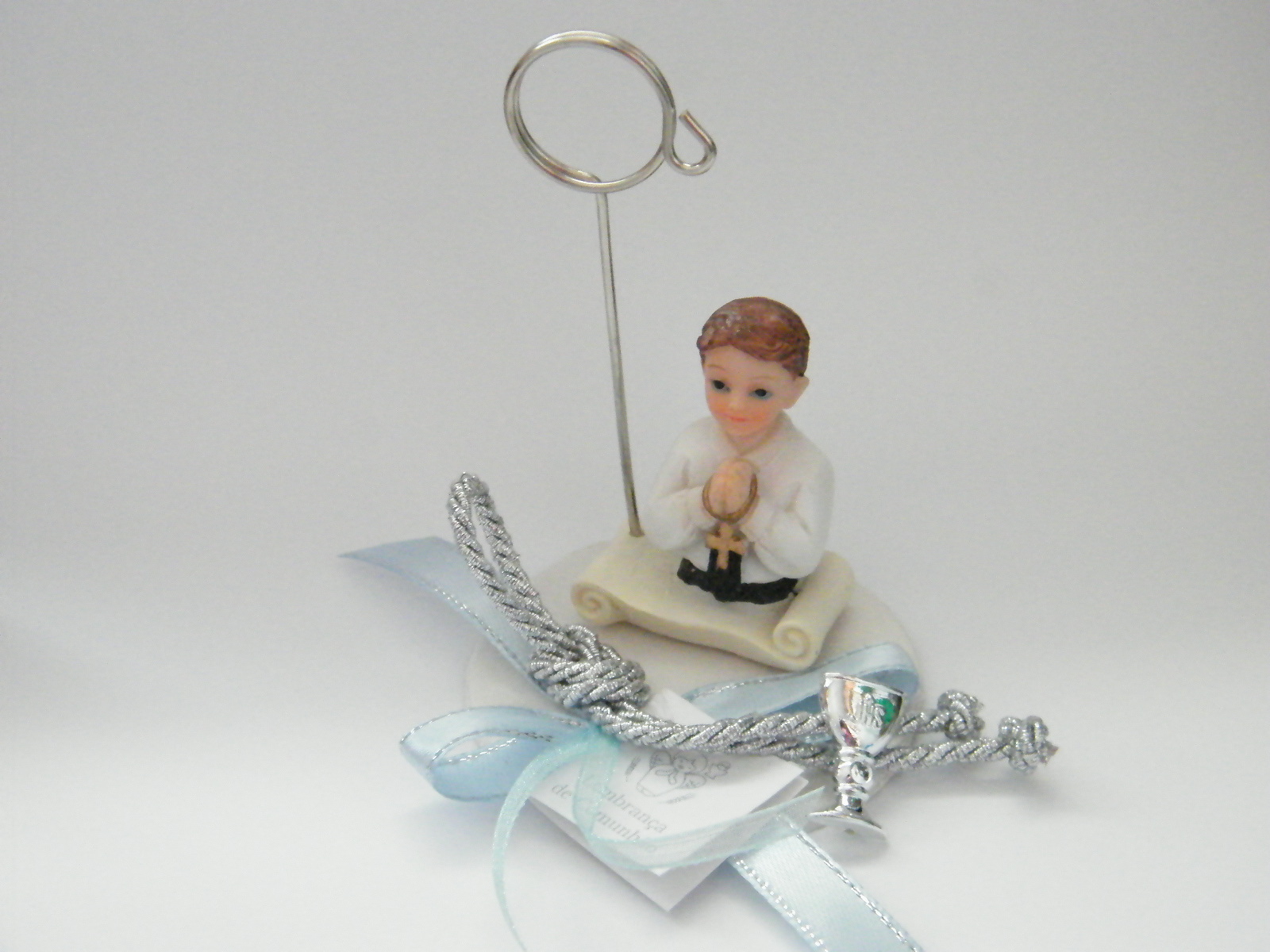 Busto menino em cerâmica, com clipe metal, sobre base hóstia branca decorada com laço cruzado em fita setim azul de rebordo prata e bonito cordão prata em nó, com um cálice prata na terminação.