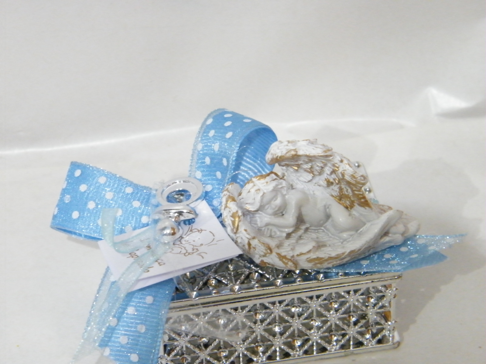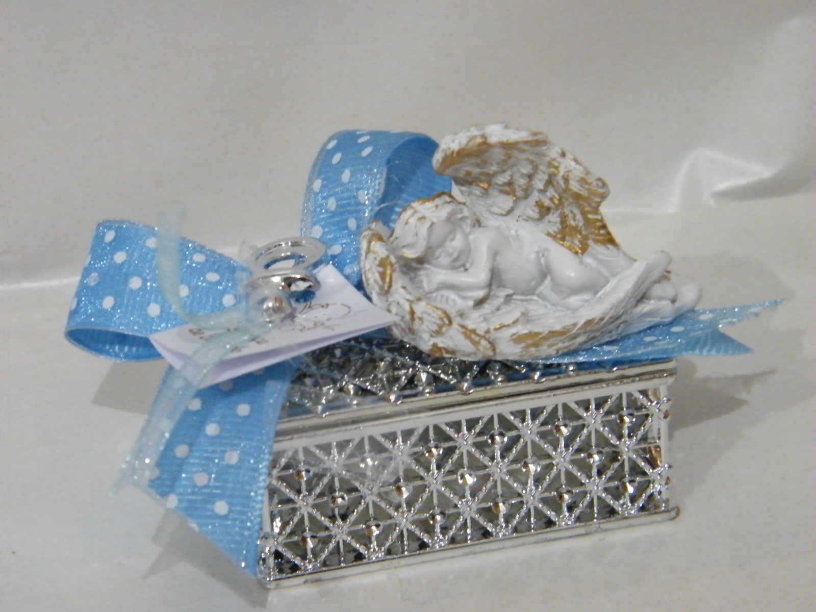 Caixa (5,5 x 4 x 2,5cm) em acrílico recortada com sabonete no interior, decorado azul e prata com anjinho (5cm)branco em cerâmica a dormir sobre as asas.