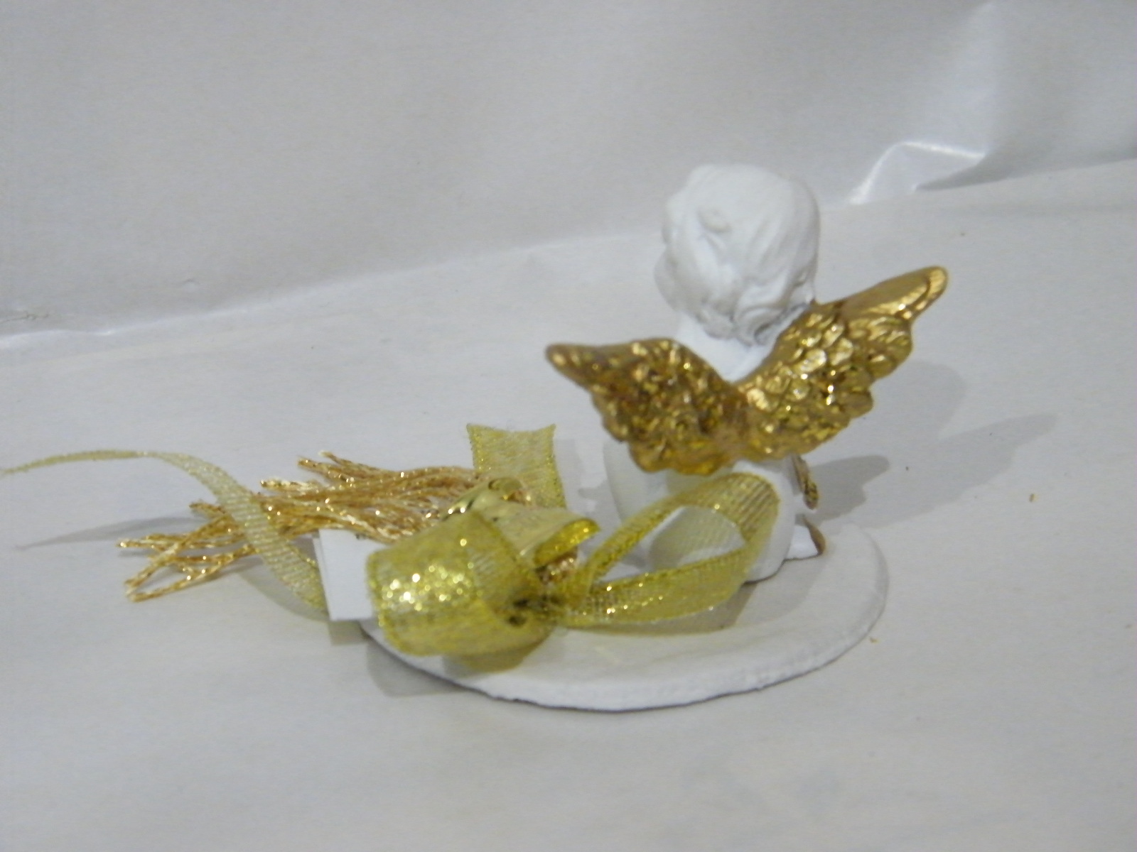 Hóstia gigante (6cm) como base, decorada com lacinho dourado com franja e cálice no remate do laço a finalizar  um bonito anjo(5cm) em cerâmica branca com asas douradas.