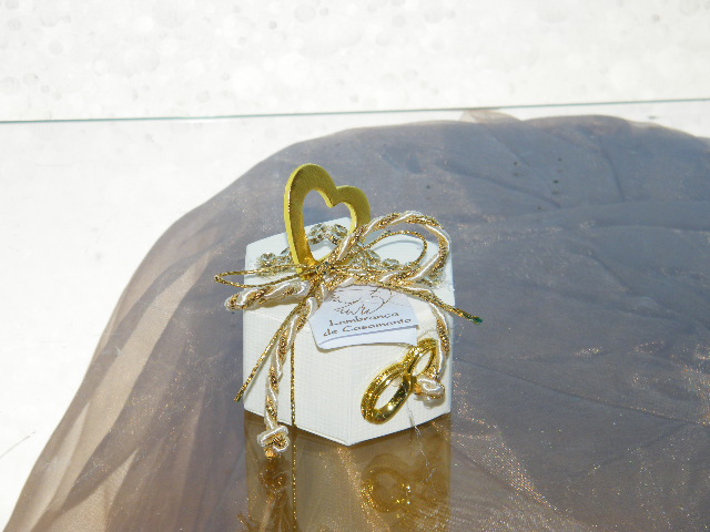Caixinha hexagunal em cartão com drageia de chocolate, decorada com um coração dourado,fita metalizada brilhante dourada, laço em cordão matizado perola/dourado e aliançãs douradas.