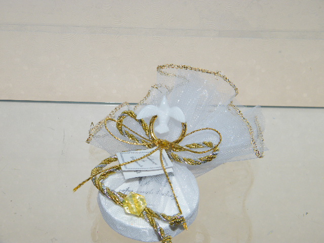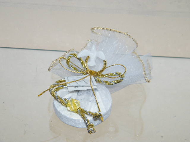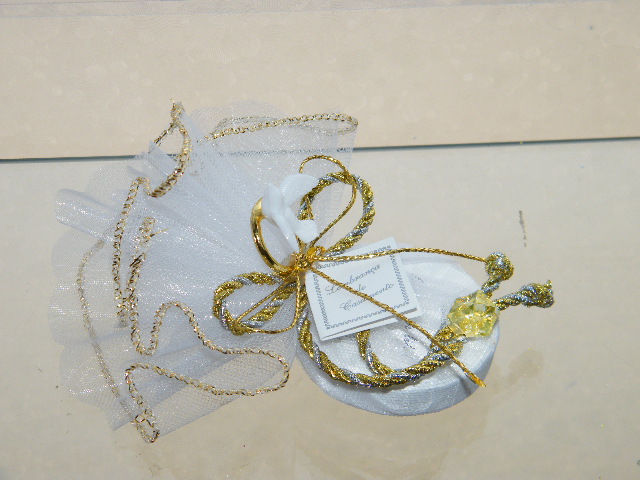 Trouxa em tule de reborbo dourado com sabonete, decorado com laço simples em cordão matizado prata/ouro, uma aliança dourada com pomba branca e uma pedrinha acrilica dourada a prender o cordão.