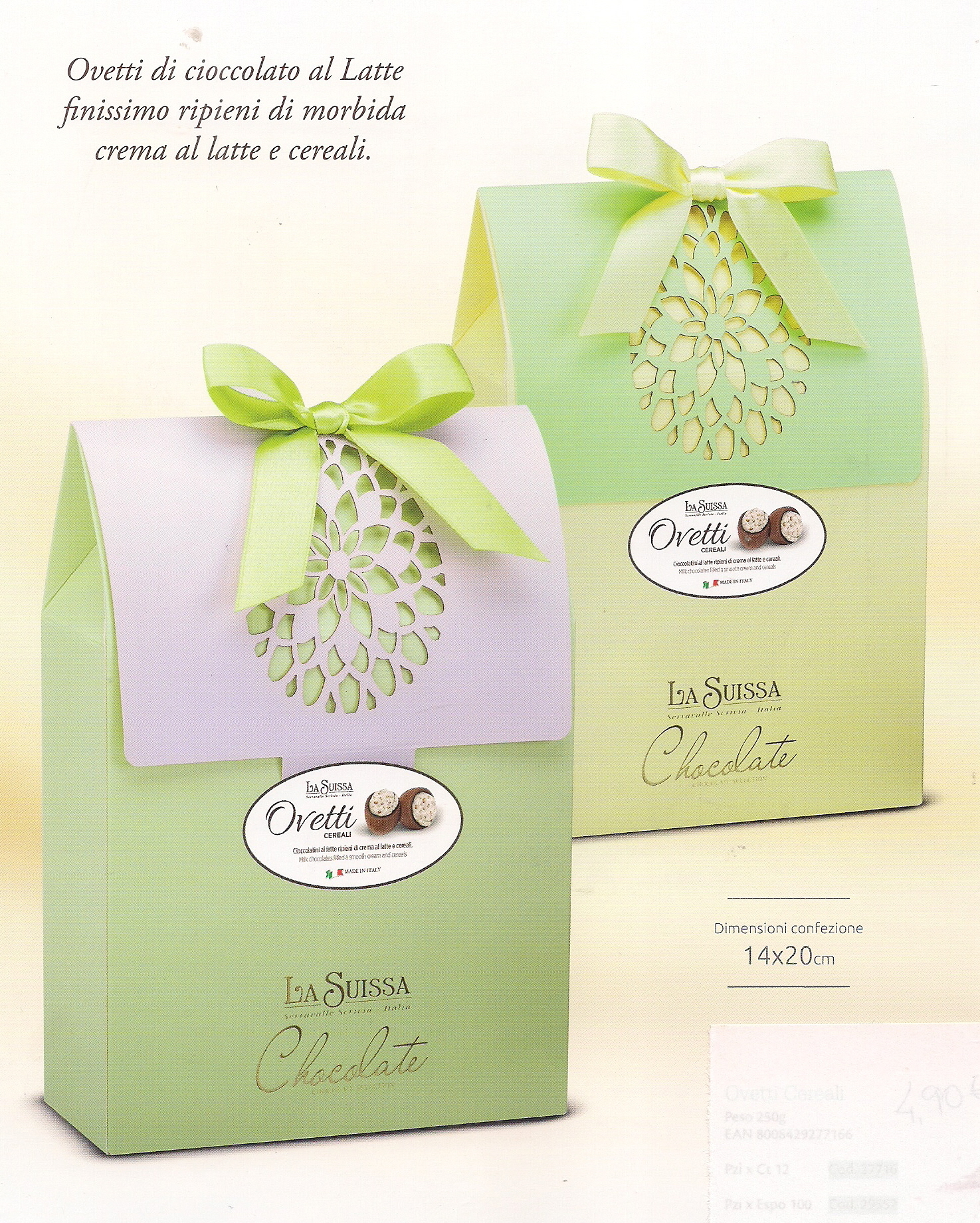 Caixa nos tons verde/amarelo ou amarelo/verde com 250Gr de ovinhos chocolate de leite com creme de leite e cereais.