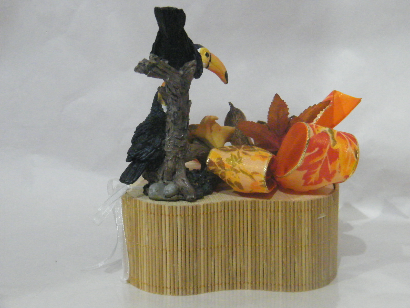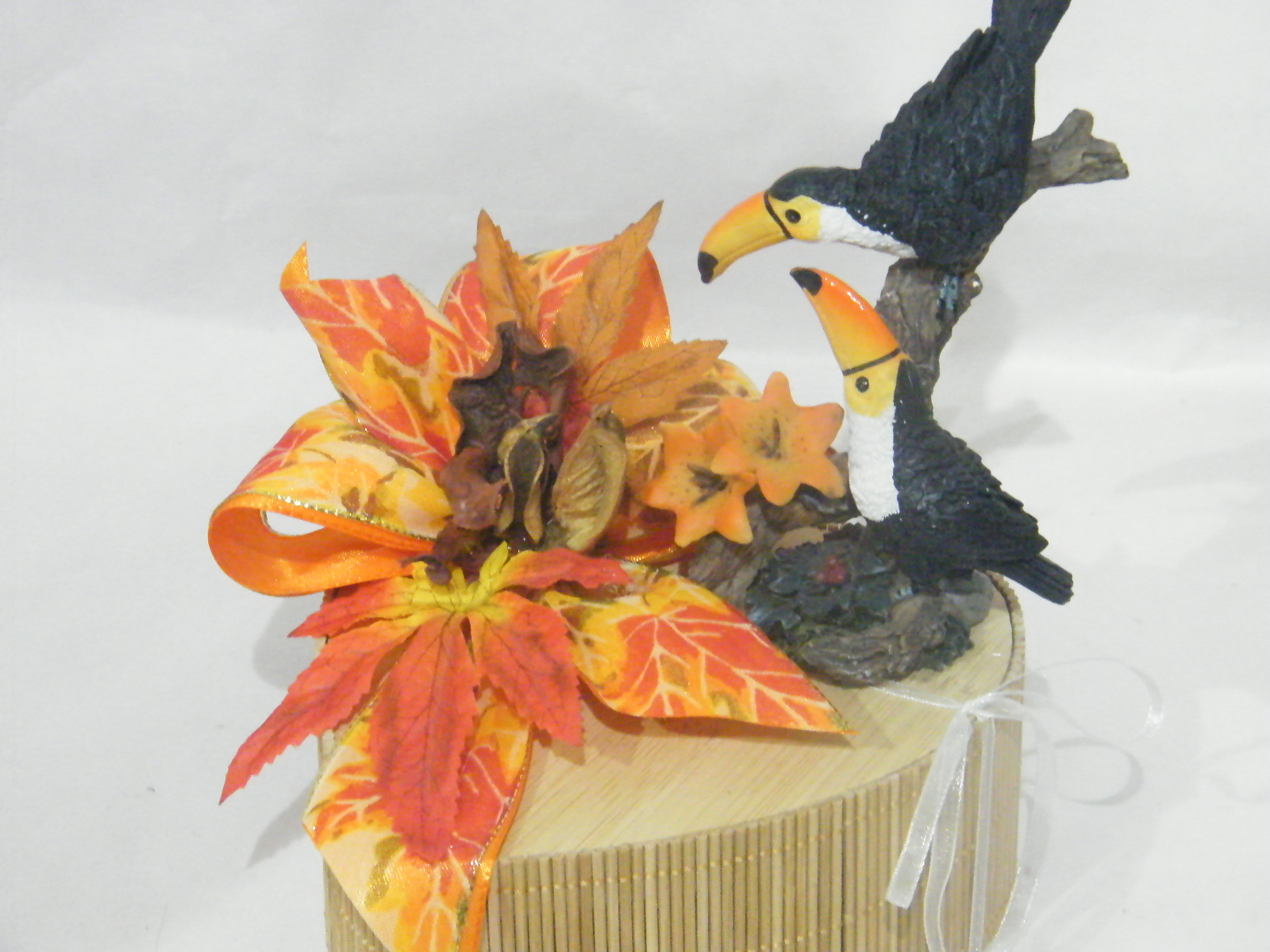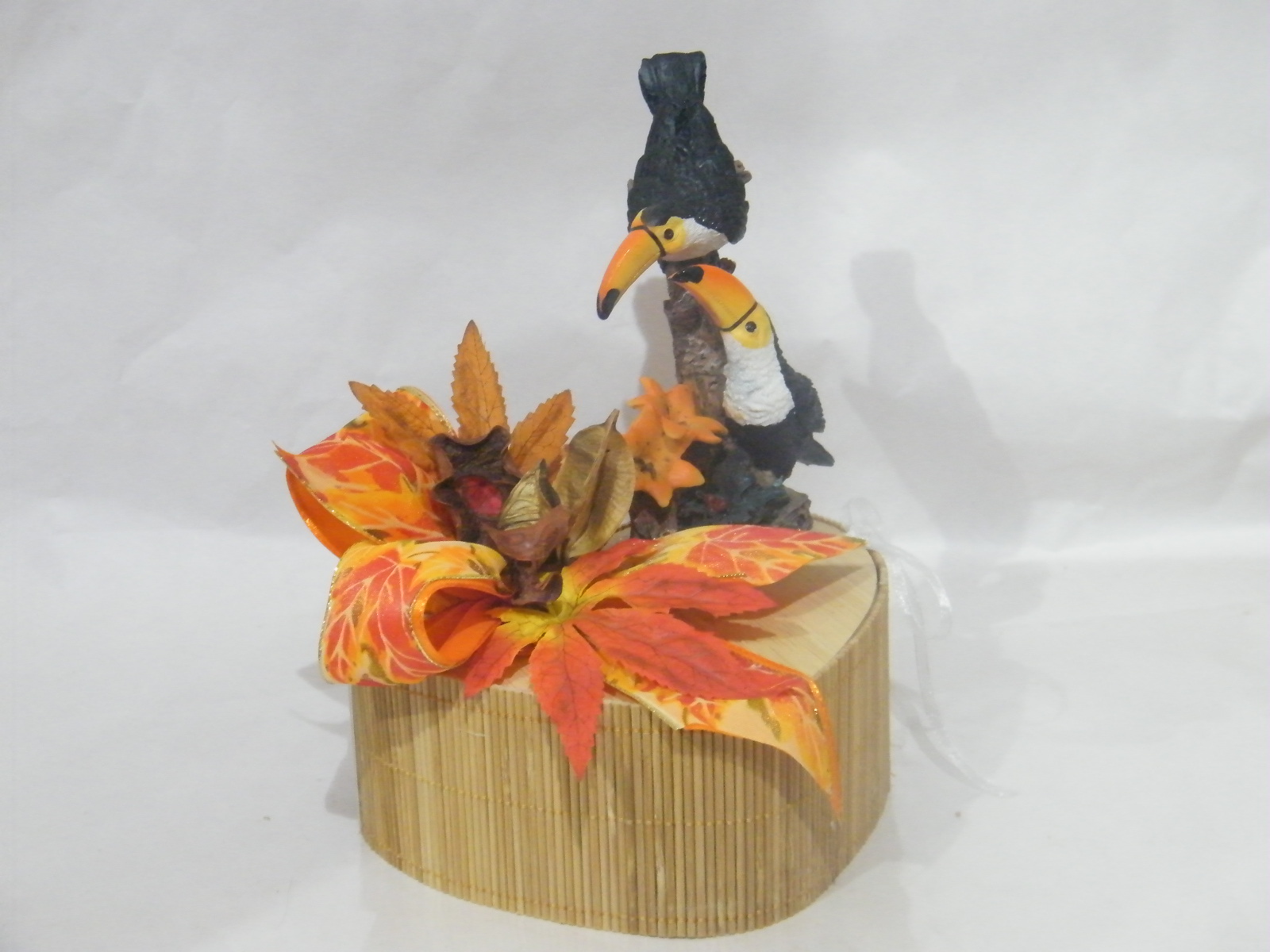 EntrarCaixa de bambu em foma de coração (15cm x 6cm), recheada com 200gr de maravilhosos bombons, decorada com bonito arranjo outonal composto por um pomposos laço em fitas tecido estampado tema outono, folhas, flores secas e tucanos em cerâmica.
