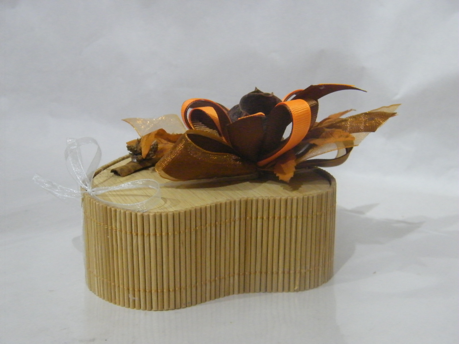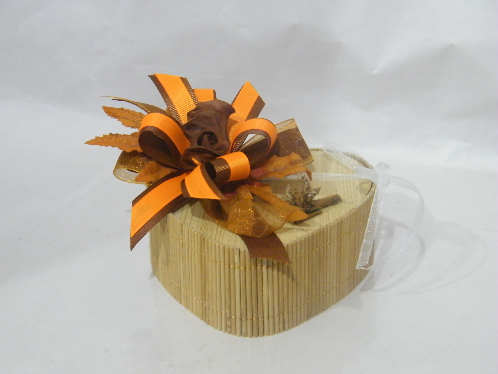 EntrarCaixa pequena de bambu em foma de coração (11cm x 4cm), recheada com 100gr de maravilhosos bombons, decorada com bonito arranjo outonal composto por um pomposos laços em fitas tecido e organza nos tons castanho e laranja, folhas e flores secas.