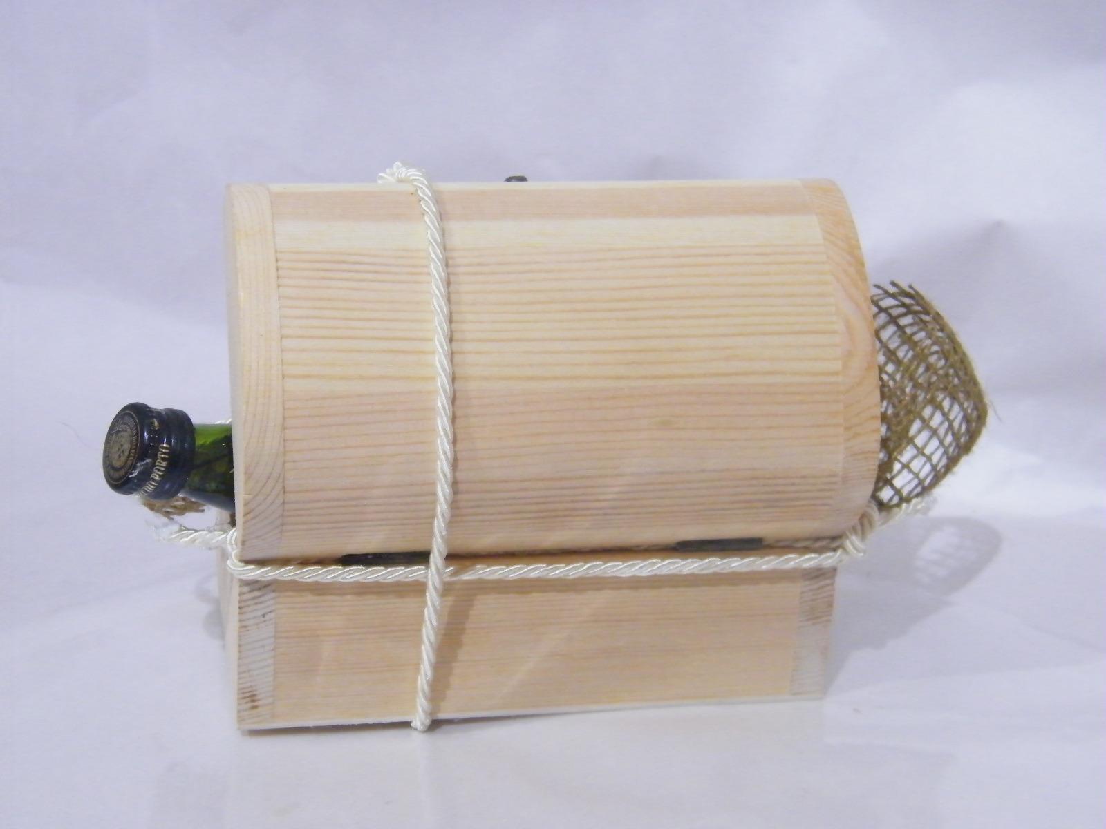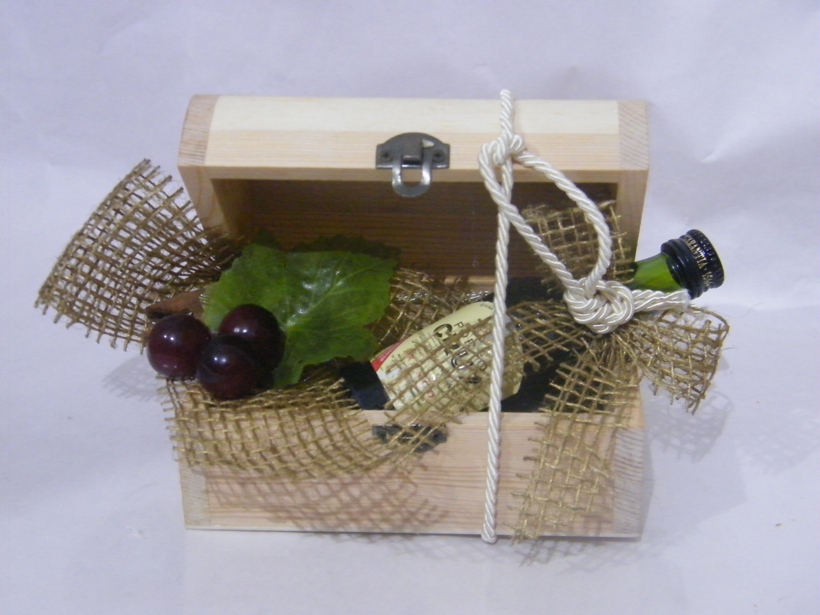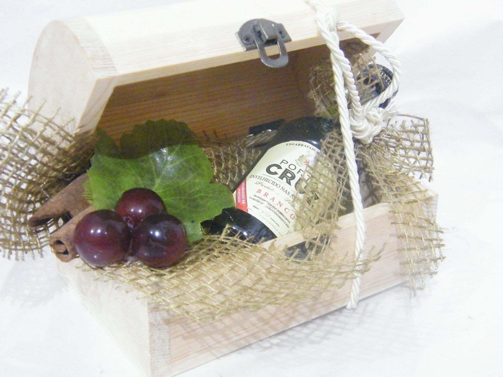 Baú madeira ( 13cm x 7cm x 6.5cm) com garrafa de vinho Porto Cruz (5cl) decorado com laços em rede dourada paus canela, parra e uvas artificiais.